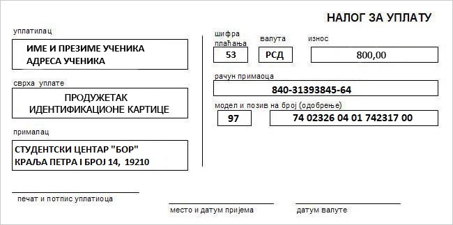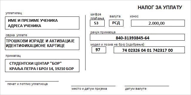 Трошкови израде и активације ученичке ИД картице: 2.000,00 динара